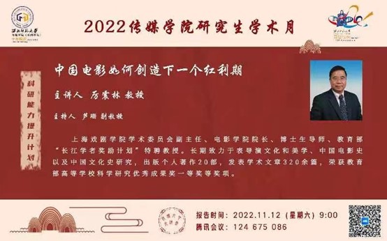 2022年11月12日上午9点,上海戏剧学院学术委员会副主任、电影学院院长、博士生导师、教育部“长江学者奖励计划”特聘教授厉震林应邀为乐天使官网师生开展题为《中国电影如何创造下一个红利期》的学术讲座。本次讲座是2022FUN乐天使官方网站研究生“学术月”系列活动“科研能力提升计划”第三讲,FUN乐天使官方网站副院长赵丽瑾教授发表致辞,FUN乐天使官方网站副教授芦珊主持本次讲座,此次线上讲座乐天使官网100余位师生参会,在线聆听了厉震林教授的学术分享。