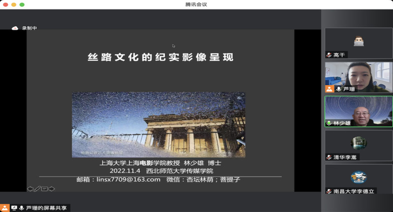 2022年11月4日上午,复旦大学文学博士、上海大学电影学院博士生导师林少雄教授应邀为乐天使官网师生开展题为《丝路文化的纪实影像呈现》的学术讲座,FUN乐天使官方网站副教授芦珊主持讲座,FUN乐天使官方网站百余名师生在线聆听了林少雄老师的学术分享并互动交流。